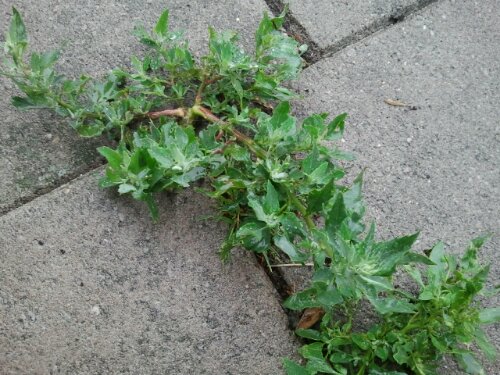 Waiting at the bus stop today, I was delighted to see that there is a survivor from the council mowed Fat Hen (Lambs quarters) population in the nearby scrubland! Here it is, looking defiant and determined to spread seed, in a pavement crack close by. Not one for picking though as its likely been walked over many times and is so close to the road.  Its seeds won’t know the difference however and this little urban warrior may help to populate the scrubland next year. I do hope so, Fat hen is one of the tastiest wild* vegetables that I know.