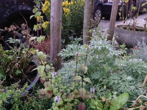 It has faired very well over the summer. The self seeded Artemisia absinthium (Wormwood) is looking very strong, self seeded Geraniums also like the spot and a few other plants too. These include a Curry plant ( Also a type of Artemisia I think), Lavender, Calendula from seed, Mint, Ivy (that has less of a good time in the warm months) and Goldenrod.