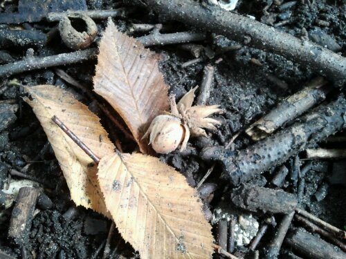During a five minute squirrel-style frenzy, in the soil and dry leaves, I managed to amass a few dozen prime city Hazelnuts (Nl: Hazelaar, Corylus avellana) Delighted, is an understatement! Spurred on by my success, i took a quick tram ride home and sped to a copse of Hazel and Beech at the bottom end of Pythagorasstraat. That spot is a local’s favourite; There is a well trodden path into the copse and a scarcity of nuts but none the less, I didn’t go home empty handed! Later today, I’ll probably toast them all, add some to a hor chocolate and add the rest to Frank’s muesli tub. They should last a couple of weeks in that.