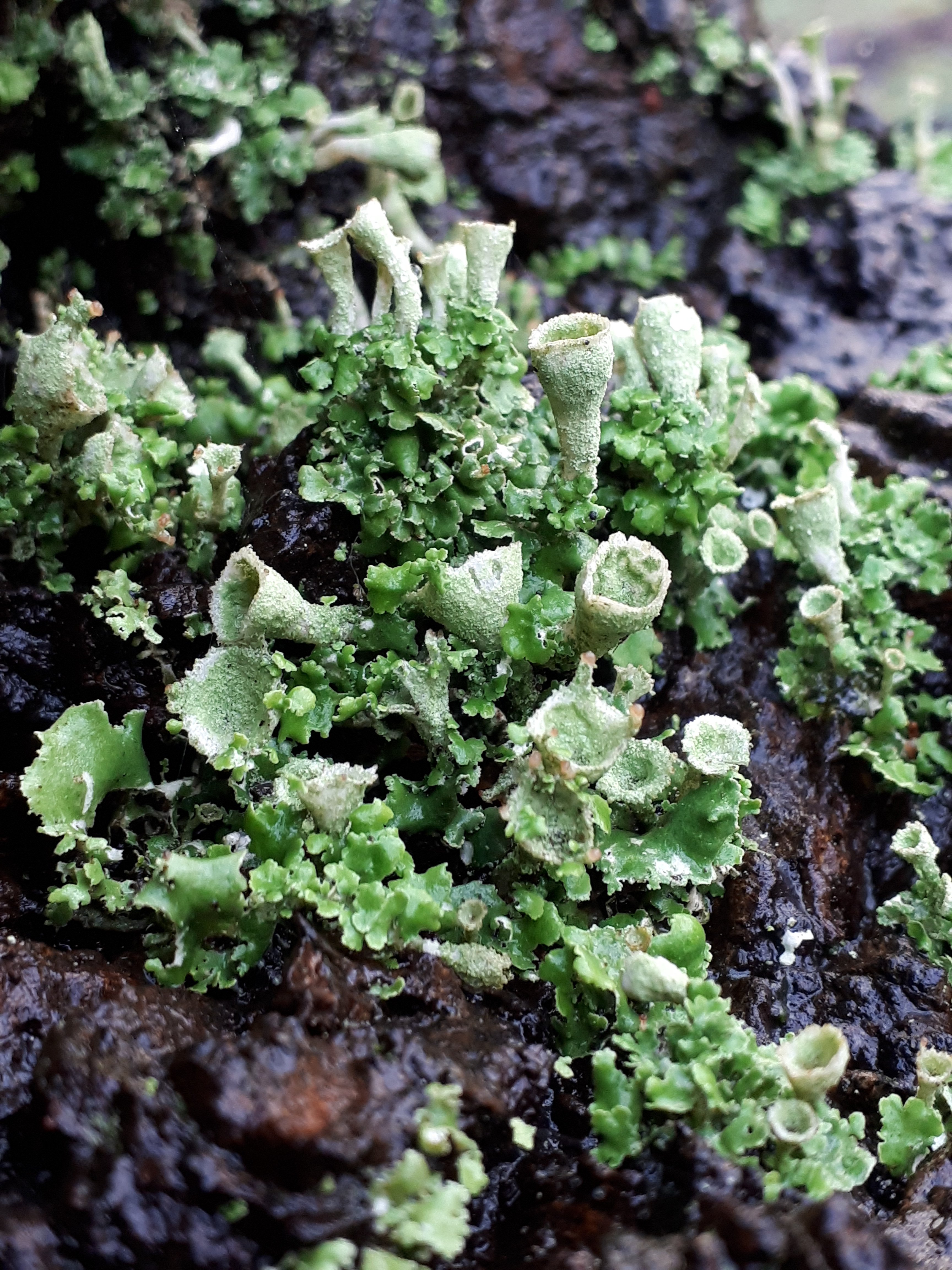 Here’s a lichen, with wonderful spore trumpets, growing crustily on an old cherry tree in Frankendael. Such a pretty life form. I could study it all day!