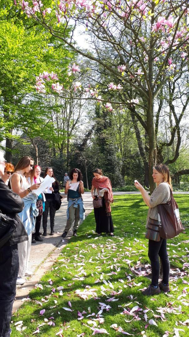 Meetup walk from Amstel Station to Park Frankendael.Tempeh making for the apprenticeship moduleRelining the little pond with a trailer cover.Leaf shapesMagnolia time continuesSpeaking about nature based spirituality at University of AmsterdamLarry the cat and the herbsLast year’s grape vine leaves come out to playCherry blossom gathering at the Orchards
