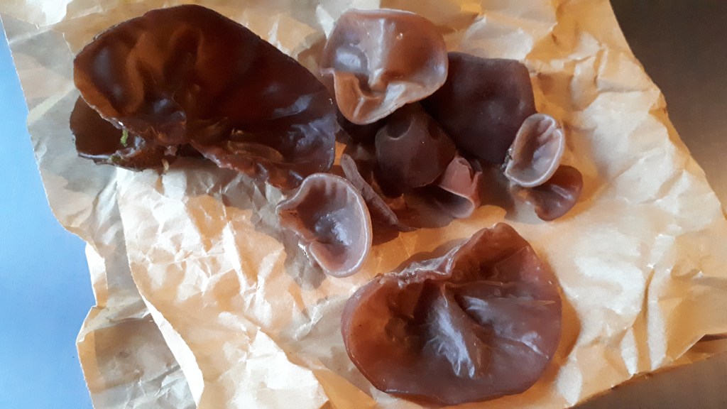 Jelly ears don’t have a strong flavour and they smell of the mossy woods which they come from. They have this particular crackle-crunch when cooked and munched and I really like them. They are not crunchy or crackly when fresh however. When on the tree, they are totally gelatinous, unmistakably ear shaped, have a velvety upper texture, a another under texture and are pure jelly in the middle. They can be pulled carefully off the wood rather like a bit of turkish delight. I like everything about them!