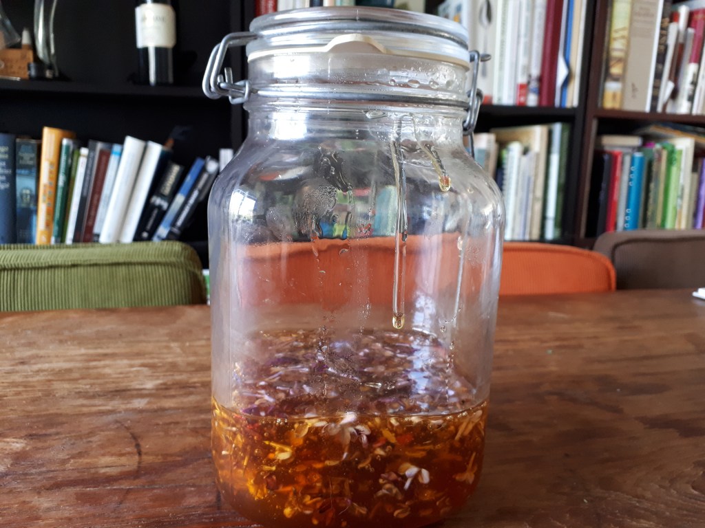 Laat het mengsel intrekken zolang je het kunt verdragen om te wachten. Het basisproces duurt niet lang (een dag), maar naarmate je langer wacht met deze stap, krijg je een veel interessantere mede. Ik vind dat een paar weken voldoende is om een aangename complexiteit van smaak te ontwikkelen in de honinginfusie. Houd gedurende deze tijd, indien mogelijk, dagelijks de infuserende honing in de gaten. Controleer of de bloemen helemaal met honing doordrenkt zijn, vooral tijdens de eerste dagen, anders kun je bruin wordende bloemen vinden – een zeker teken dat zuurstof de bloemen bereikt en rotten mogelijk maakt. Sommige mensen houden ervan om de verzegelde pot een week lang elke dag ondersteboven te houden om het probleem te voorkomen. Ik ben er meer ontspannen over, maar ik zorg er dubbel voor dat er de eerste paar dagen geen lucht in het mengsel achterblijft en dat de bloemen doordrenkt zijn met honing.