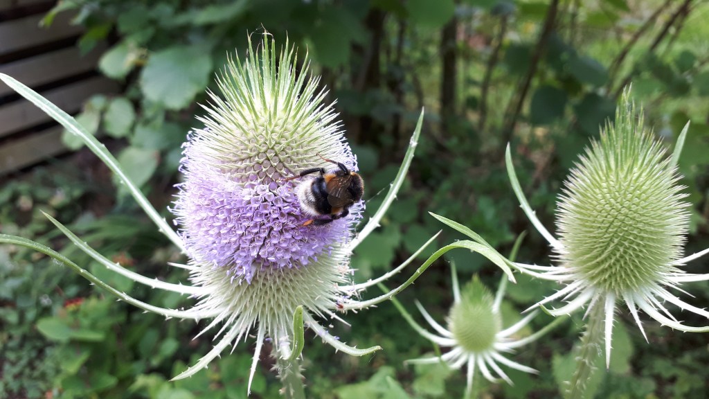 The bumblebees are essential to the process of pollinating those tiny flowers. They busy about, over the purple rings, from about 8am, each day that there is sun. As they wander around the flowers, burrowing in for nectar, they also kick off the dead flowers of the day before. They do literally seem to kick them off. If you manage to watch a teasle being “worked” one morning, you may be lucky enough to see the tiny purple flowers falling to the ground, as a bumblebee wanders around the flowerhead either biting or kicking them off. This appears to be pure symbiosis and is a great pleasure to observe. It puts the day to come in perspective and I recommend it!