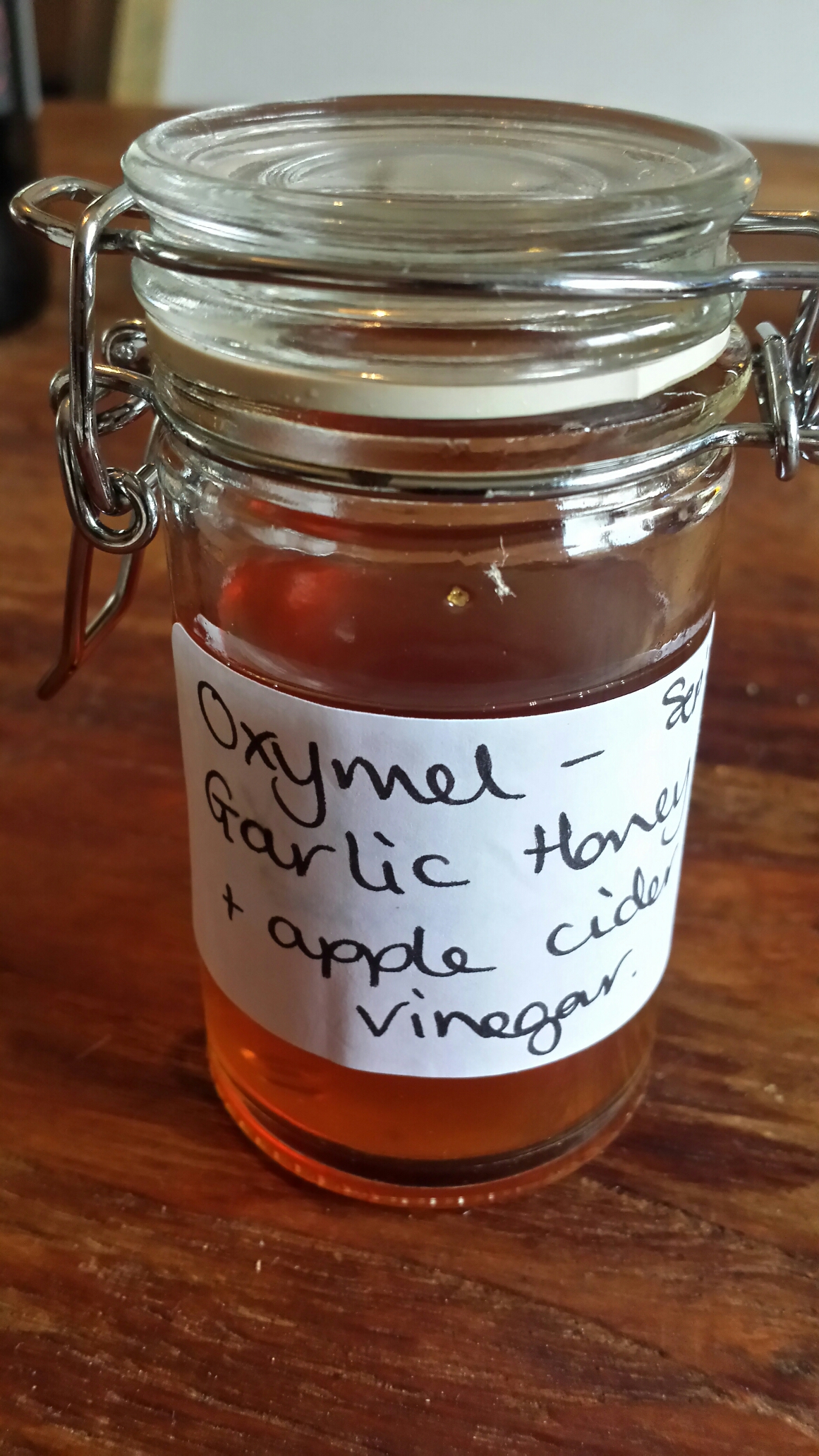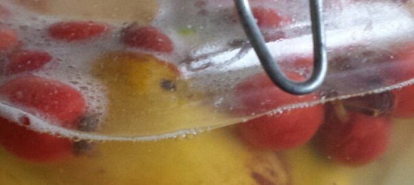 4. Covered completely with runny honey. Use a chop stick or knitting needle to loosen trapped air bubbles. You may need to release the air and top up with honey several times. The jar should be filled to the brim with honey. The air bubbles won’t all leave the honey but prodding with chopsticks, helps them to escape and thus reduces the risk of contamination.