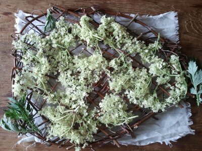 When you pick Elderflowers, gather them into a paper bag if possible, being careful to take the precious pollen home with you. Nip them cleanly from the tree as whole sprays of flowers. I use my thumbnails to do this usually or a small pair of kitchen scissors. When you get them home, lay them face down (stalks up) on a white surface for a while to allow bugs to climb out from the flowers. Here you can see some of today’s harvest drying breifly on my Willow rack. I tend to harvest some Elderflowers to dry completely for winter cold and flu remedies but most of my harvest is eaten freshly or turned into sweet treats and drinks. Elderflower honey is the perfect base for many of these recipes and is far more simple than making a sugar syrup. If you are vegan or just don’t want to use honey, you could infuse a vegetable syrup such as oat syrup or agave syrup in the same way. Honey has the added benefits of being a medicine in itself and keeps indefinately is stored well, so preseving herbs in honey is my logical choice. Be aware that honey may contain Botulism spores which can be lethal to children under one year of age (their immature immune systems are not equipt to fight Botulism).