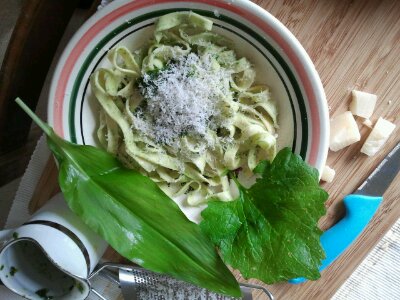 Firstly, gather three Wild Garlic (Allium ursinum, Ramsons, NL: Daslook) leaves. Give them a quick rinse and pat them dry with a clean tea towel or similar. Finely chop the leaves and place them in a very small glass jam jar. Cover with extra virgin olive oil and poke around a little with a chopstick or cocktail stick, to release trapped air bubbles. Top up if necessary, to keep the leaves covered in oil.