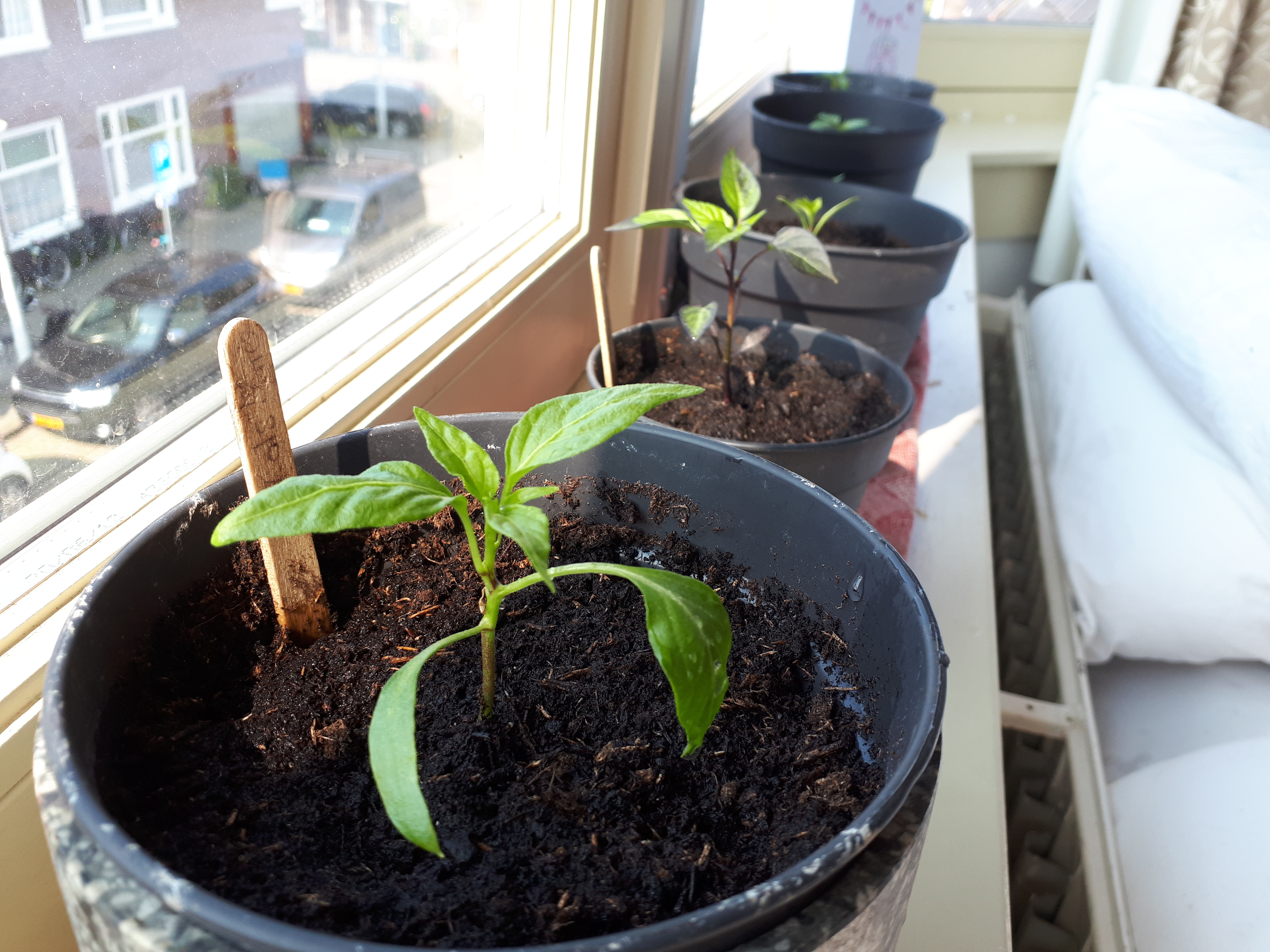 As you can see in the video, I shook out the shrubs onto a bright blanket, placing tumbling beetles and larvae in a glass jar which became enormously interesting to local kids. We had about 30 bugs in there by the end. The leaf layer was totally cleared and I hard pruned all of the shrubs. The Rue had to go, sadly as I loved it and few people seem to grow it these days. However, I was delighted to find that it had spawned a few babies, growing between paving slabs so I hope they will make it in the newly prepared plot. My daughter and I scoured the geveltuin and surrounding area for more beetles and larvae before giving the remaining plants a really good watering and then enriching the soil slightly with a bucketful of spent compost (which I collect from my old rooftop pots). Later, I added a couple of lupin seedlings which I had on the roof, a few radish and beetroot seeds, some potted tulips from the kitchen balcony and some self-seeded Lemon balm, which was growing across the street in the gutter. A cheap and cheerful geveltuin makeover! The project took a few hours and I am satisfied with the result.