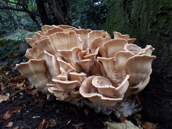 Fungi This seems to be the fruiting bodies of Giant polypore (Meripilus giganteus – Thank you Peter!) and what a gorgeous specimen the photo on the left preserves. Found these are at the base of a mature Beech tree, in woodland at the end of a lovely herb walk. The base of the tree is spiraled by clumps of specimen of this fungus, each one at a different stage of decay. This type of fungal fruiting body decays very quickly. Quite a site to behold.