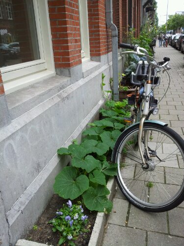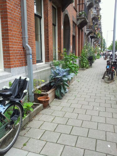 I had a pavement garden put in by the city council, beneath our Amsterdam apartment, soon after we moved here 13 years ago. Such pavement gardens are narrow strips, right up against the buildings, were the pavers get lifted and removed, making the sand beneath available as a planting area for residents. You need to draw up a plan and get written permission from your neighbours, when you request a new one – It was quite exciting I can tell you. Well, my neighbours approved my idea and after the council workers set it up for me, I poured in a couple of bags of compost and planted it up with Rosemary (Rosmarinus officinalis), Purple Sage (Salvia officinalis ‘Purpurascens’), Rue (Ruta graveolens)and Lavender (Lavendula augustifolia). Everything in there grew really well, even though the little plot faces full south, is under a bay window and gets little rain. It was a lovely, simple Mediterranean herb garden. The herbs were resplendent and many neighbours would snip off a little Rosemary through the growing season, to add to their cooking. That shrub was enormous and very healthy.