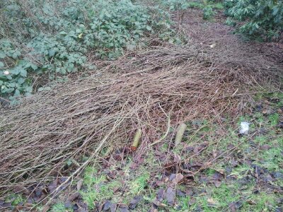 Last week, I noticed that the willows of my local Amsterdam park had been coppiced. So, I took my secateurs back to the park and “harvested” a small bundle of fresh withies from the pile I found on the ground. This made little impact on the pile, which had clearly been left to fill the gap in a bramble thicket, beside a small lake.
