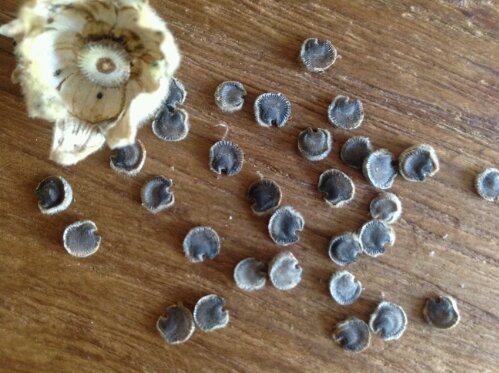 Here are some Hollyhock seed heads from the plant which found its way to my geveltuin last year. I harvested one really dry, ripe seed head today and collected the seeds from within. They are beautifully arranged in a wheel-like pattern and are big enough for kids to deal with.