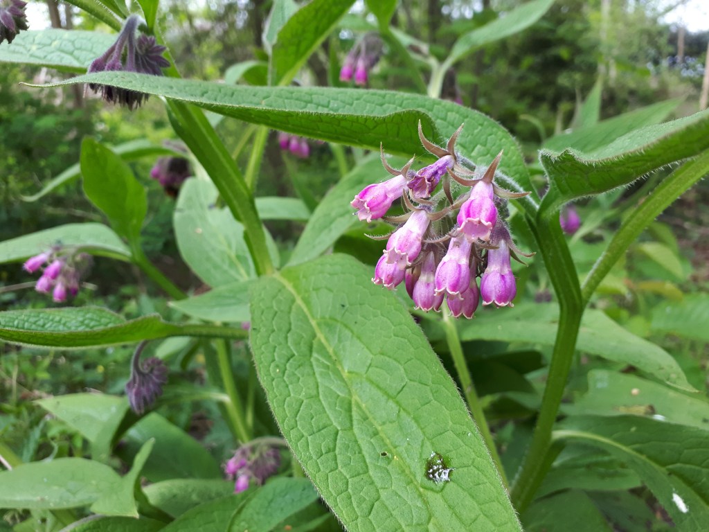 Comfrey plants are in bloom. This helps up to identify the species and help discern whether the comfrey growing near you in the white flowering Symphytum officinale, which is not seen as safe in internal preparations (such as teas) but helpful in external preparations (such as skin salves) or Symphytum uplandicum, which tends to have leafy parts which don’t contain the hepatotoxins in it’s leaves and flowers.
