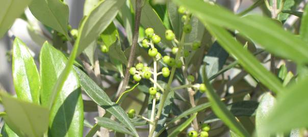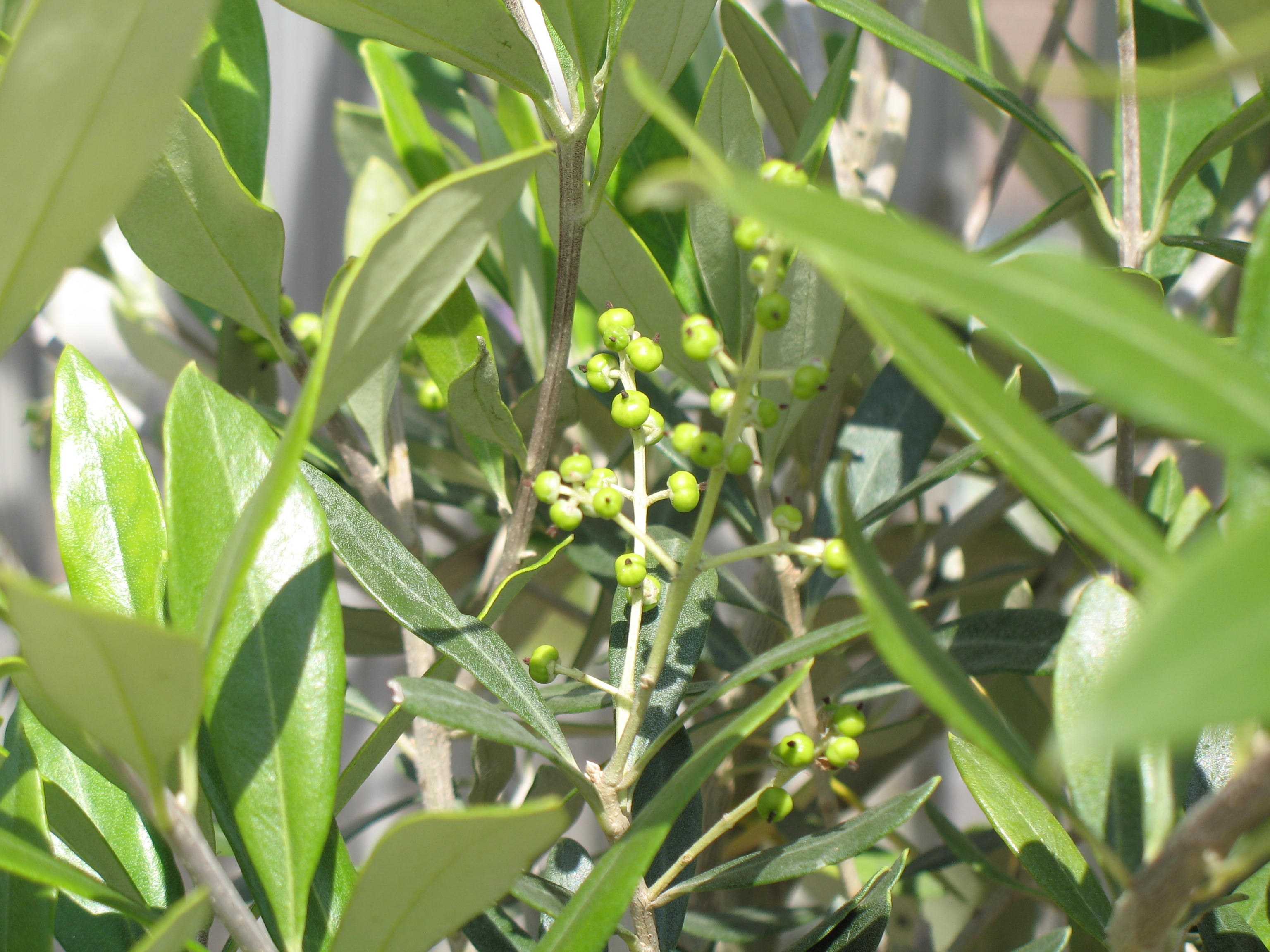 Olive, with little Olives! We lost our roof top Olive last winter, during the drop freeze, but they can do just fine here, if protected in mid winter. No need to wait for the fruit, the leaves are also useful.