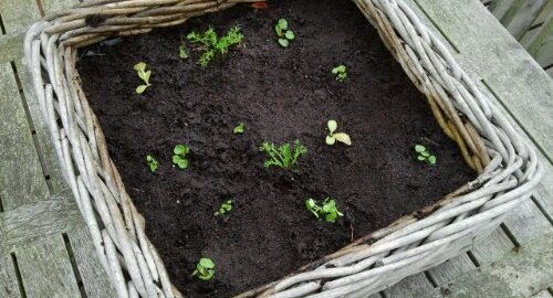 I guess you’d call this a table planter of edible herbs. It’s also a good way to rehome some self-seeded plants. I planted it out yesterday using some herb & salad seedlings, which had spread around other pots on my roof terrace. I filled the planter last year, using shop-bought seeds and although the plants didn’t have space to grow very large, they were really useful. This time I was able to relocate some seedlings of watercress, lettuce, and chamomile, which I added to the pot and supplemented with a sprinkling of old seeds.