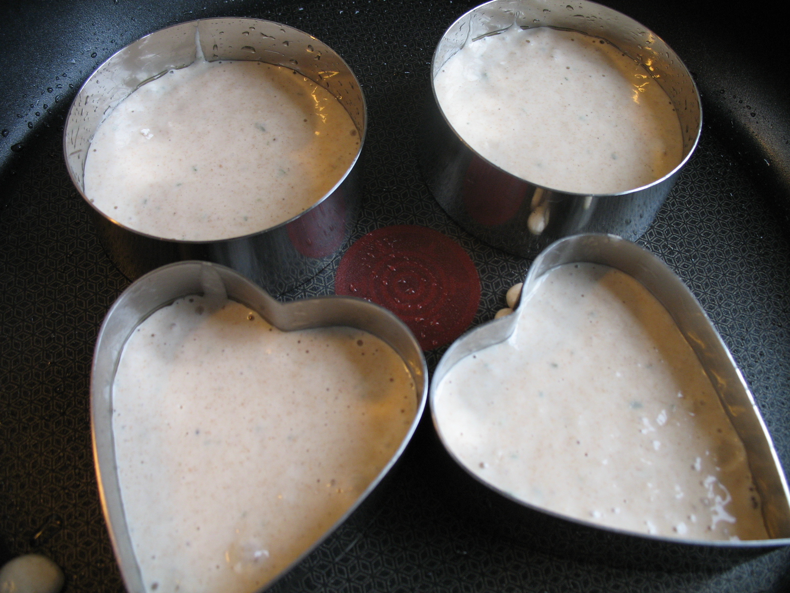 - Place the rings on the griddle or frying pan and spoon about 1cm depth of batter into each ring. N.B. The batter will further expand as it cooks so adding a greater depth will only result in overflowing rings or crumpets which are uncooked in the middle.