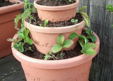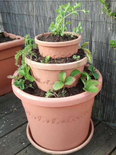 Here’s my latest rooftop planting creation: A simple tower of three plastic plant pots, packed with plenty of molehill soil and organic compost.